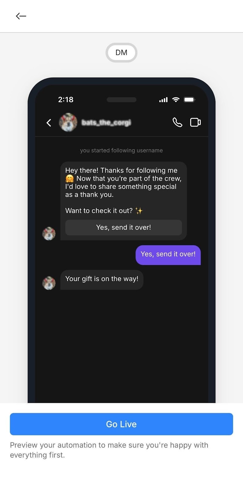 Você pode configurar a automação Seguir para DM diretamente no aplicativo móvel Manychat. O processo pode ser feito em ambientes iOS e Android e leva apenas alguns minutos para ser concluído.