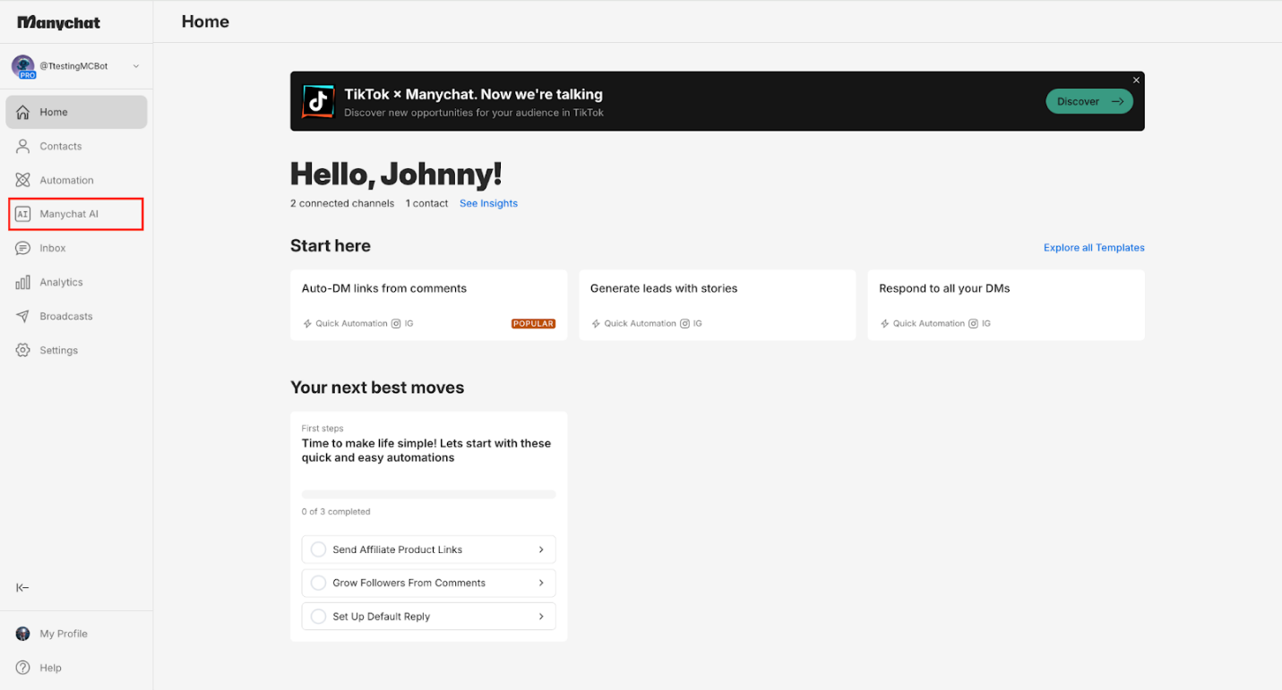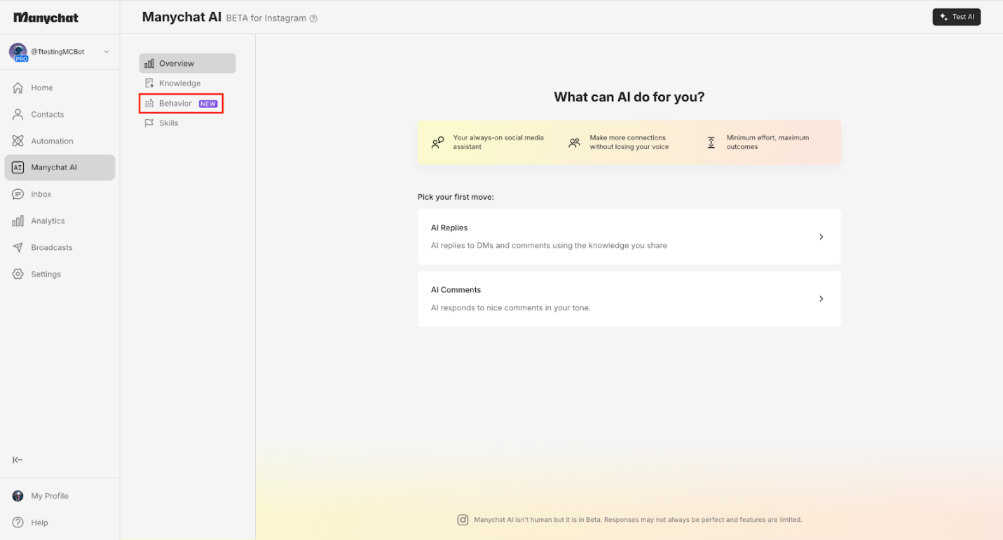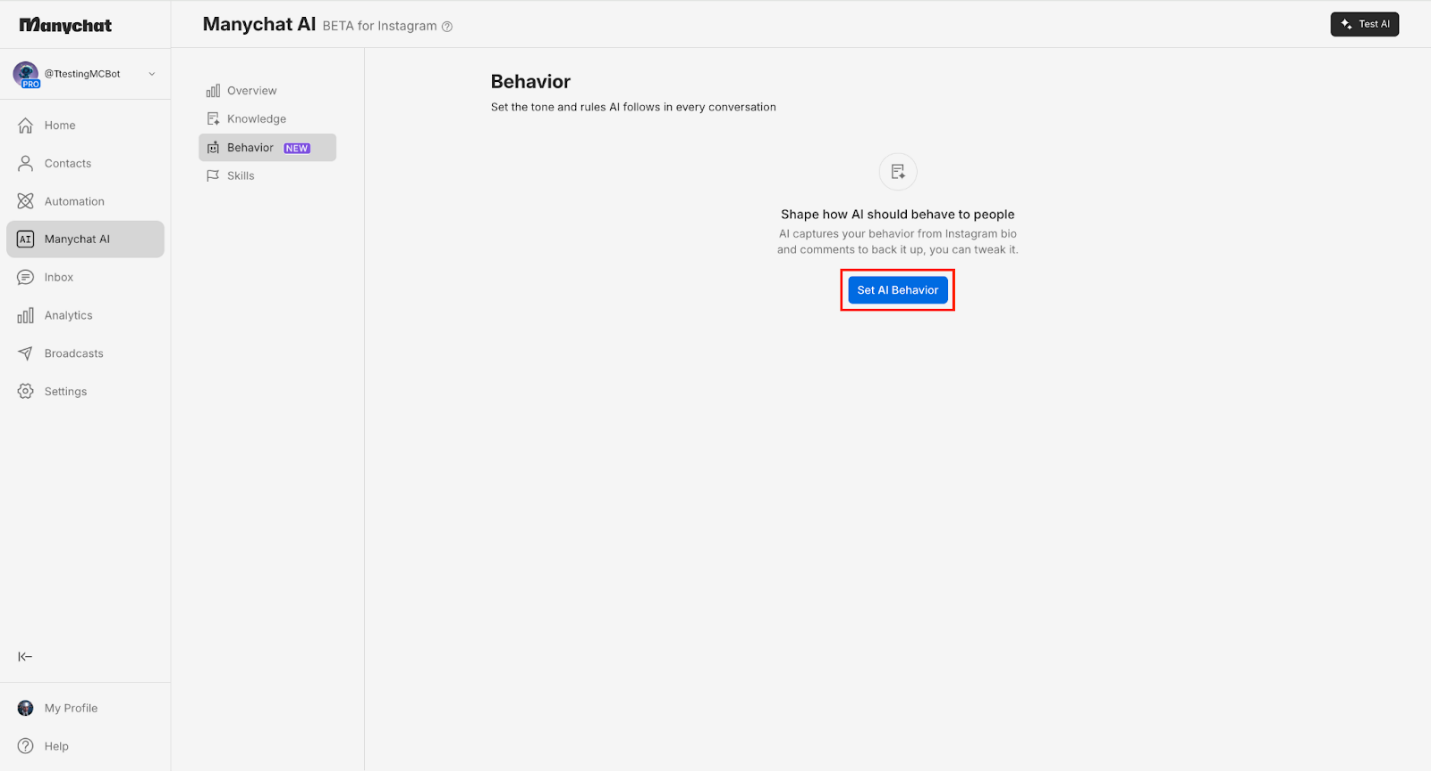- Se estiver usando o Behavior pela primeira vez, você verá o botão Configurar AI Behavior. Assim que você clicar no botão, a IA irá analisar a página do Instagram conectada à sua conta Manychat. Ela utilizará as informações da biografia da página e os comentários recentes para aprender mais sobre sua empresa e como você se comunica com seus contatos.